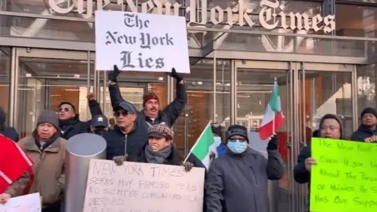 "Esto de mentir realmente mata, porque empiezan a mentir y empiezan a invadir, y es cuando vienen muchas fatalidades en países como en el Medio Oriente. Y también ha pasado aquí en Latinoamérica, como en Chile, en Argentina, en Perú, en Bolivia", acusa un morenista con altavoz que es flanqueado por algunas decenas de personas con pancartas y banderas de México, apostadas afuera de la puerta principal del diario neoyorkino.
