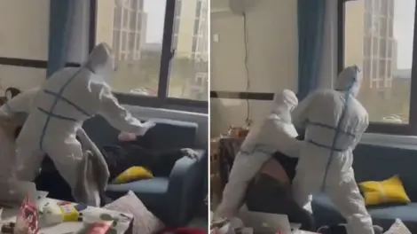 Se puede escuchar a una mujer que filma el horror que se desarrolla pidiéndoles a los oficiales de materiales peligrosos que "no sean tan violentos", reportó The Sun. Los dos agentes del confinamiento, conocidos como "Da Bai" o Big Whites por sus uniformes, gritan "pónganse la máscara". Luego intentan agarrarlo y él intenta aferrarse a un sofá.