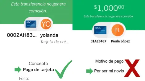 Se recomienda utilizar conceptos simples y claros, como 'pago de colegiatura', 'pago semanal teléfono' o 'pago renta'. Para depósitos a amigos, frases sencillas como 'comida' son preferibles.