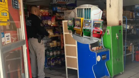 Agentes de la AMIC decomisaron un arma de fuego, 11 máquinas tragamonedas, papel de arroz, pipas y jeringas para insulina en cinco tiendas de abarrotes ubicadas el norte de Hermosillo.