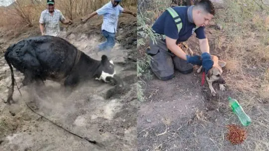 Por otro lado, segundo reporte se atendió alrededor de las 15:00 horas, en el interior del Río San Miguel, en el ejido de El Tazajal, donde una vaca se encontraba atorada en el fango acumulado.