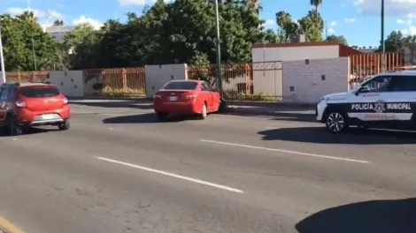 Producto del congestionamiento vial que se origina en el bulevar Luis Encinas, un sedán de color rojo se impactó contra un poste al intentar meterse a uno de los carriles de la vialidad.
