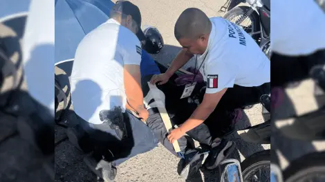 El oficial Domínguez Corrales, quien también es paramédico, fue el primero en llegar al lugar del accidente. Tras realizar una exploración física, detectó una deformidad en el miembro inferior izquierdo del motociclista, por lo que procedió a inmovilizarlo con una tabla y vendaje antes de ser trasladado a la clínica 14 del IMSS para recibir atención médica especializada.