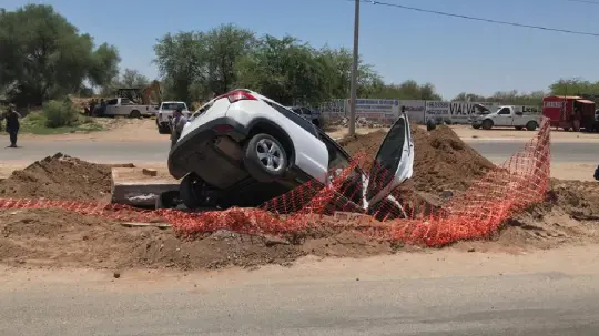 Por utilizar el teléfono celular mientras conducía, su vehículo cayó en el interior de una obra de reparación de agua potable, en el sector poniente de la ciudad de Hermosillo, durante la tarde de este miércoles.