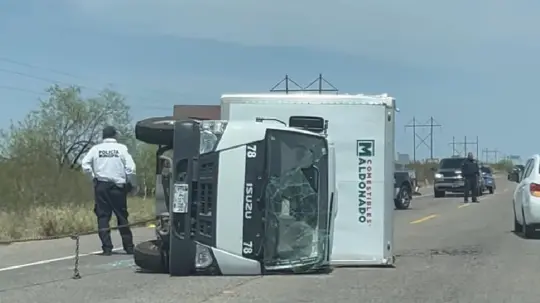 Camión de carga volcado por exceso de velocidad en Hermosillo-Bahía de Kino
