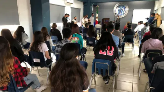 Fue previo a una conferencia para la población estudiantil impartida por la psicóloga Diana Chávez, que el director del plantel, Allen McCallum, firmó el documento junto al Presidente Municipal para dar fe de las actividades en conjunto entre municipio e institución.