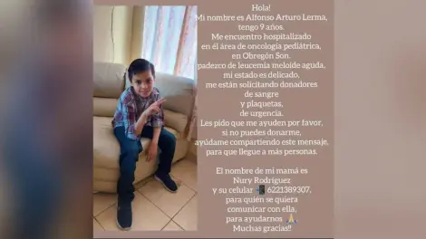 La sangre del pequeño es B positivo, pero la donación puede ser de cualquier tipo. Los interesados en apoyar se pueden comunicar al número 622 138 9307 con la madre, Nury Rodríguez.