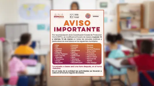 El titular de la Secretaría de Educación y Cultura (SEC) en Sonora, Froylán Gámez Gamboa, informó que los días 13 y 14 de marzo se modificará el horario de clases en 29 municipios de la entidad, con el fin de proteger la salud de la comunidad escolar ante la llegada del nuevo frente frío.