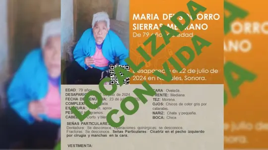 María del Socorro había desaparecido el pasado 22 de julio de 2024 en Nogales, Sonora. Fue vista por última vez el lunes 22 cuando salió de su domicilio ubicado en el Fraccionamiento Lomas del Sol. Desde entonces, se desconocía su paradero y existía preocupación por su integridad, temiendo que pudiera ser víctima de un delito.