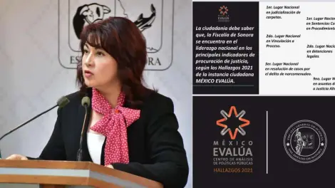 "La ciudadanía debe saber que, la Fiscalía de Sonora se encuentra en el liderazgo nacional en los principales indicadores, según los Hallazgos 2021 en la instancia México Evalúa. Estamos la Fiscalía de Sonora encabezando los más altos indicadores de calificación a una Fiscalía de Justicia", señaló la Fiscal General del Estado, Contreras Córdova.