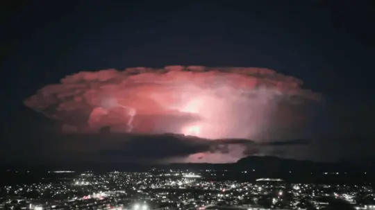Videos y fotografías captadas por la ciudadanía circularon durante horas, mostrando cómo la nube adquiría tonalidades rojizas y rosadas, acompañadas de relámpagos que iluminaban por completo el cielo.