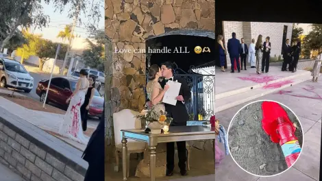 Según testigos, unos individuos le lanzaron pintura roja a su vestido de novia, presuntamente planeado por la suegra y cuñada de la joven debido a diferencias por la unión matrimonial, según cuenta el hilo de 'X' del usuario @fulanodeobregon.