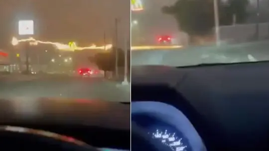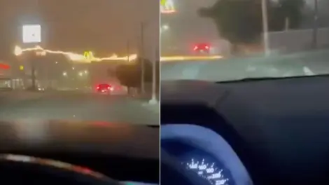 En el clip de sólo 8 segundos, se ve que el parabrisas del vehículo está sucio por la arena que ha caído en Guaymas, otro vehículo avanza adelante, cuando el cielo se ilumina.