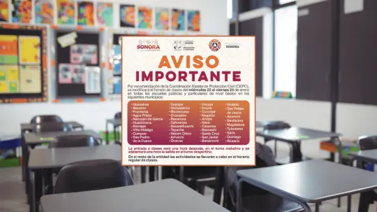 El titular de la Secretaría de Educación y Cultura (SEC) en Sonora, Froylán Gámez Gamboa, anunció que el horario de clases será modificado en 41 municipios de la entidad del 22 al 24 de enero.
