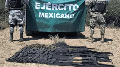 Elementos de la Guardia Nacional (GN) y del Ejército Mexicano aseguraron armamento, municiones y equipo táctico en un operativo realizado en Pitiquito, Sonora.