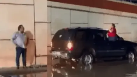 Debajo del puente ubicado entre Solidaridad y Luis Encinas, una camioneta detuvo su marcha por la vialidad inundada. Una de sus tripulantes se encontraba sentada en la ventana de la puerta del copiloto cuando comenzó a discutir con un hombre que le pedía que avanzara.