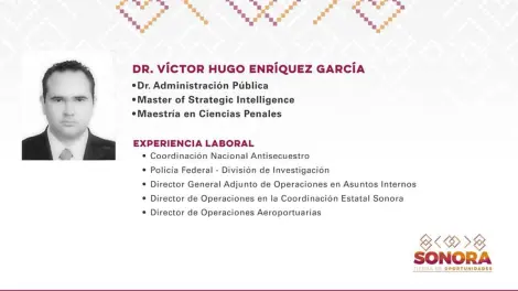 Víctor Hugo Enríquez García es doctor en Administración Pública con maestría en Ciencias Penales. Además, ha trabajado en la Coordinación Nacional Antisecuestro y en la Policía Federal, específicamente en la División de Investigación.
