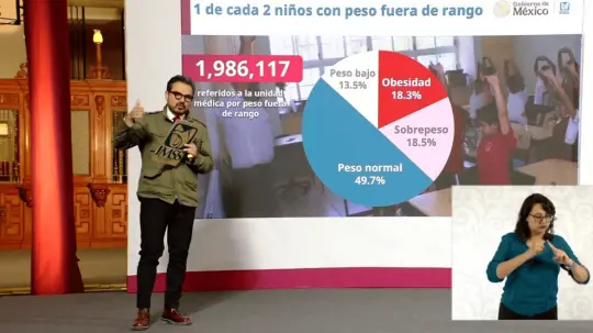 Durante la conferencia matutina del Gobierno Federal del 4 de agosto, el director general del IMSS, Zoé Robledo, dio a conocer que el 18.3 por ciento de los estudiantes de nivel básico en México presentan obesidad; el 18.5 por ciento tienen sobrepeso; el 13.5 por ciento bajo peso, y solo el 49.7 por ciento se encuentra dentro del rango de peso saludable.