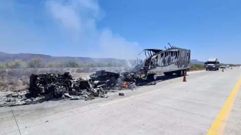 Un tráiler resulta con pérdidas materiales en su totalidad, luego de que esta se incendiara descontroladamente a la altura del kilómetro 74, sobre carretera Internacional México #15, tramo Guaymas-Ciudad Obregón.