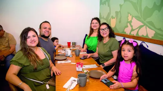 Amigos y familias disfrutan de un rico desayuno en Onza Café